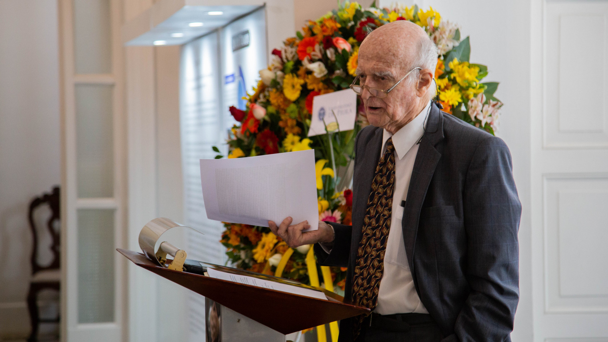 Por su parte, y en representación de la Universidad de Piura, el doctor Enrique Banús, decano de la Facultad de Humanidades, hizo entrega de un regalo floral y la más reciente publicación del Mercurio Peruano al descendiente de Víctor Andrés Belaúnde, al final del homenaje.