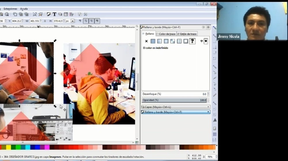 Jimmy Nicola es el profesor del taller de Diseño Gráfico. En esta actividad extracurricular (AEX) los alumnos aprenden las diferentes técnicas de producción gráfica, retoque fotográfico e ilustración digital; así como el uso del color, la forma y el espacio como modos de expresión. El profesor Nicola dice que la plataforma Zoom le brinda diferentes herramientas innovadoras para dictar el curso, como el chat de preguntas con respuestas en vivo, la pantalla compartida con los alumnos, las clases grabadas en video, foros, etc.