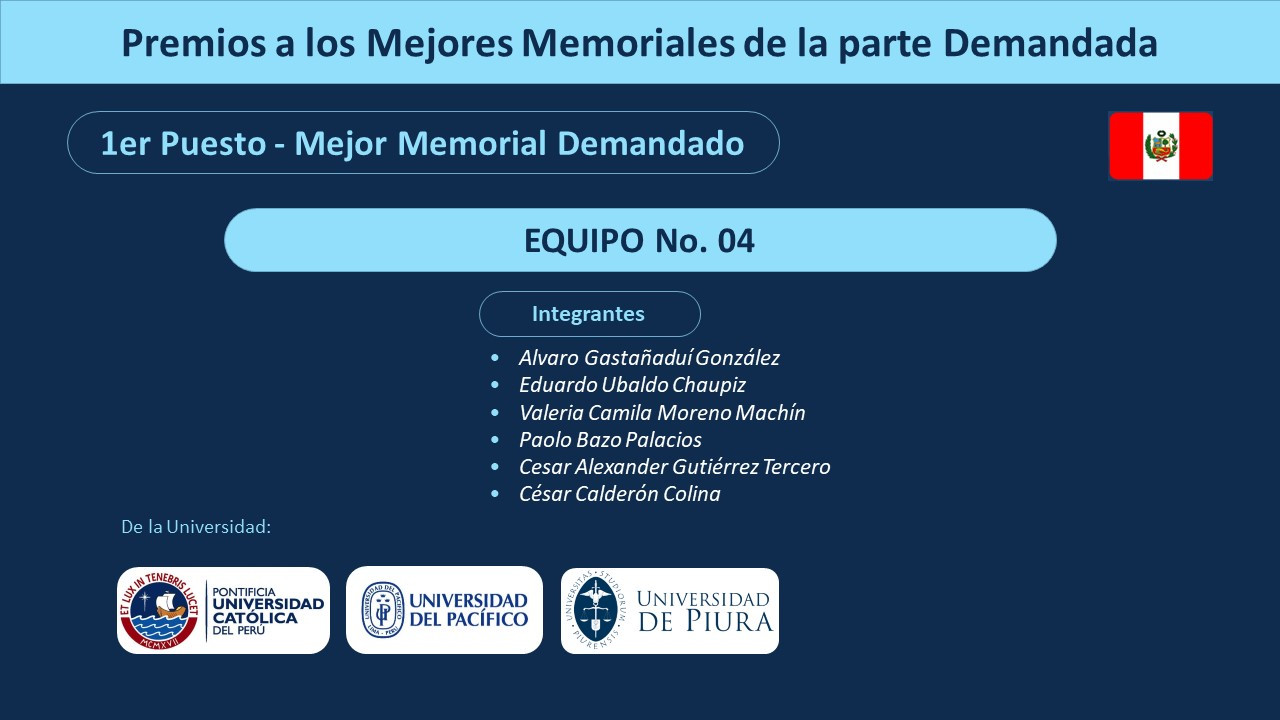 El grupo de Álvaro Gastañaduí, Paolo Bazo y César Calderón, integrado también por Valeria Moreno y César Gutiérrez (Universidad del Pacífico) y Eduardo Ubaldo (Pontifica Universidad Católica del Perú), obtuvo el segundo puesto en las siguientes categorías: Competencia principal y Mejor interrogatorio. Asimismo, obtuvo el primer puesto en la categoría del Mejor Memorial de la parte demandada.