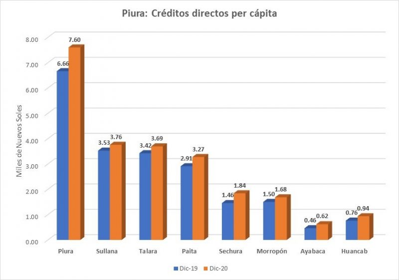 “Se ha calculado los créditos per cápita para cada provincia, teniendo en cuenta el tamaño de su población. Así, la provincia de Piura registra un monto de créditos por habitante de 7600 soles, muy superior a lo registrado en Sullana (3760), Talara (3690), Paita (3270) y Sechura (1840). En tanto, las provincias de Ayabaca y Huancabamba muestran montos menores a 1000 soles”, anota.