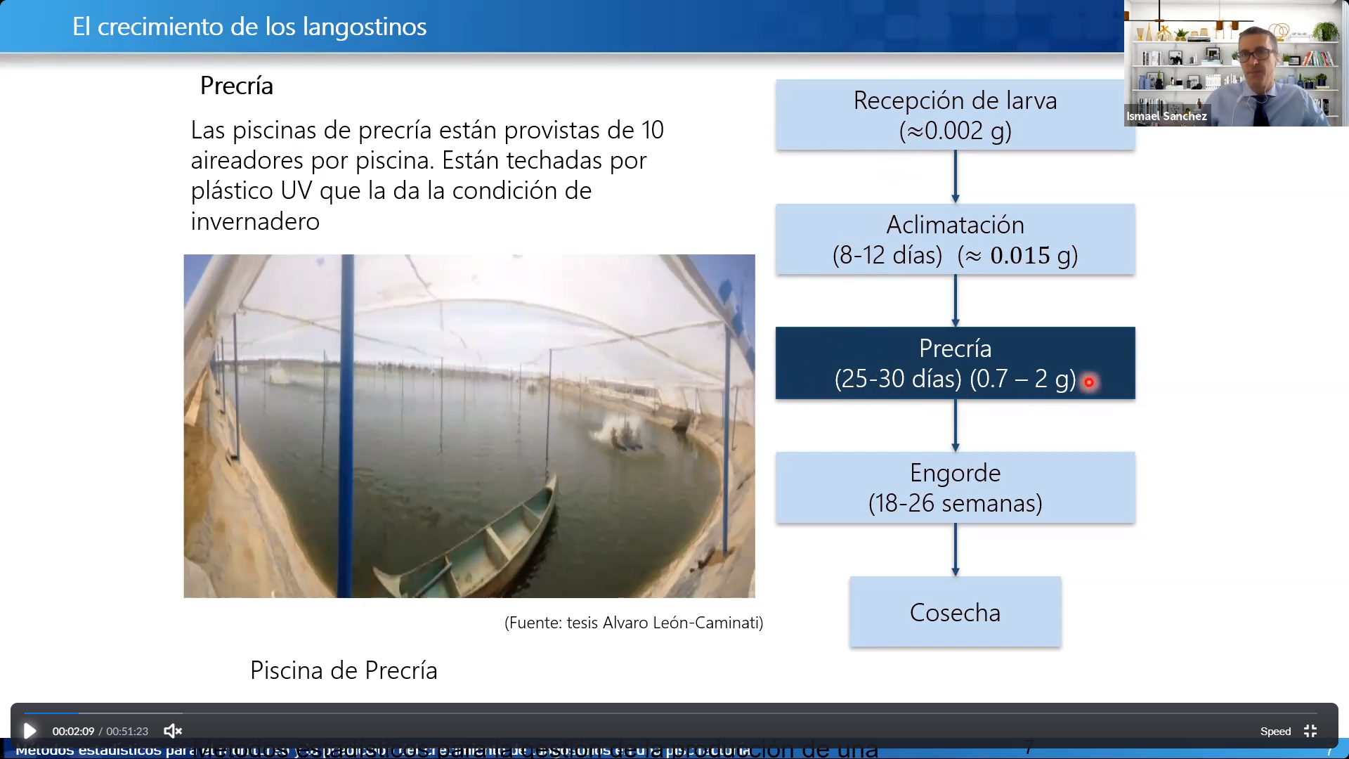 En la exposición, se explicó el proceso de crianza del langostino, partiendo por la aclimatación de las larvas una vez llegadas a la piscifactoría, la precría, el engorde y, finalmente, la cosecha. Asimismo, el monitoreo presentado se enfocó en la etapa del engorde, siguiendo una serie de parámetros como el hallazgo del peso ideal para la comercialización; así como la curva y patrón de crecimiento.