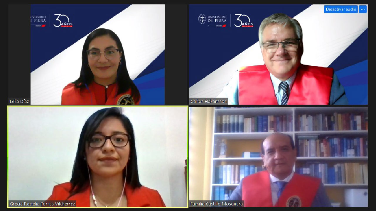 Por su parte, ante el jurado compuesto por el doctor Carlos Hakansson Nieto, el doctor Luis Fernando Castillo Córdova y la magíster Lelia Díaz Tarrillo, Grecia Torres defendió su tesis titulada “El derecho fundamental a la salud y su exigibilidad en el ordenamiento jurídico peruano”.