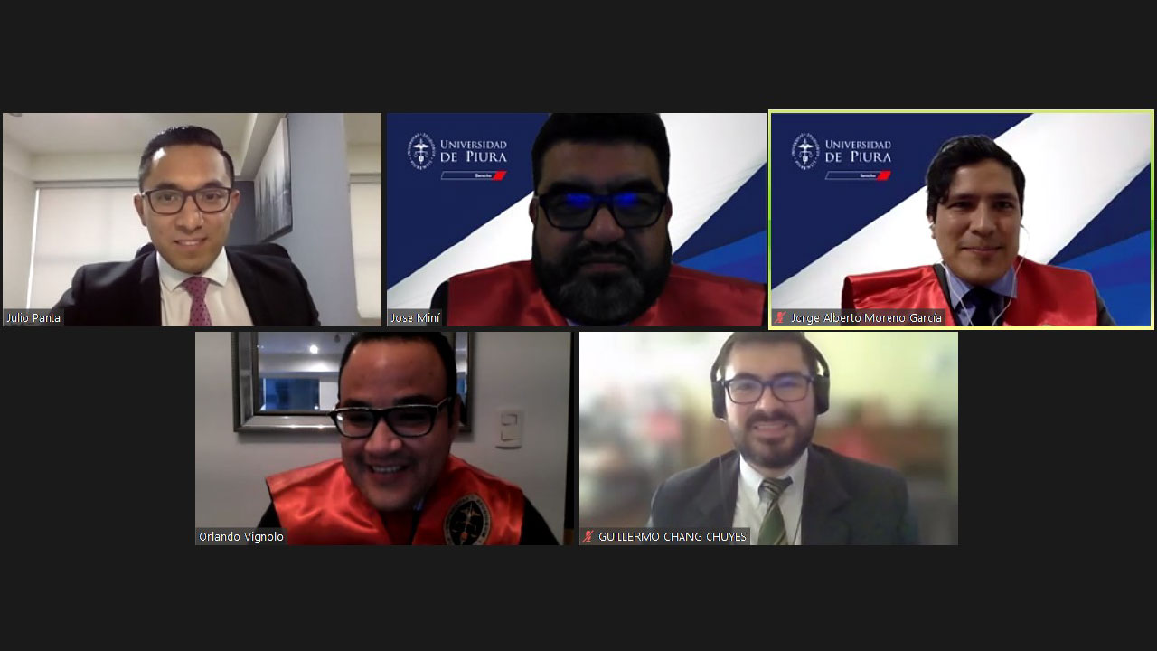 Finalmente, ante el jurado integrado por el doctor Orlando Vignolo Cueva, el magister José Mini Miranda y Jorge Moreno García, el bachiller Julio Panta defendió su tesis titulada “El ser y actuar del comité revisor en la aplicación de la cláusula antielusiva general”.