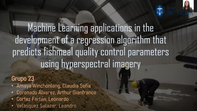 El proyecto Aplicaciones de Machine Learning para predecir parámetros de control de calidad de la harina de pescado usando imágenes hiperespectrales destacó por su aporte a la optimización de costos de mano de obra y el tiempo en la medición de la calidad de la harina de pescado, sin comprometer el producto final. Lo formularon Claudia Amaya, Arthur Coronado, Leonardo Cortez y Leandro Velásquez.