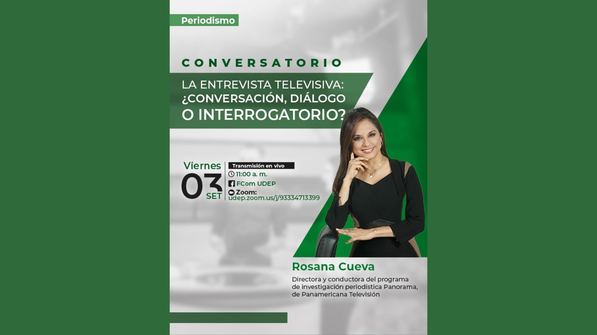 La Facultad de Comunicación de la Universidad de Piura ha organizado el conversatorio virtual “La entrevista televisiva: ¿conversación, diálogo o interrogatorio?”, que estará a cargo de Rosana Cueva Mejía, directora y conductora del programa periodístico Panorama desde el 2009 y egresada de la Facultad de Comunicación de la UDEP (1984). Esta actividad se realizará el viernes 3 de setiembre a las 11:00 a. m.