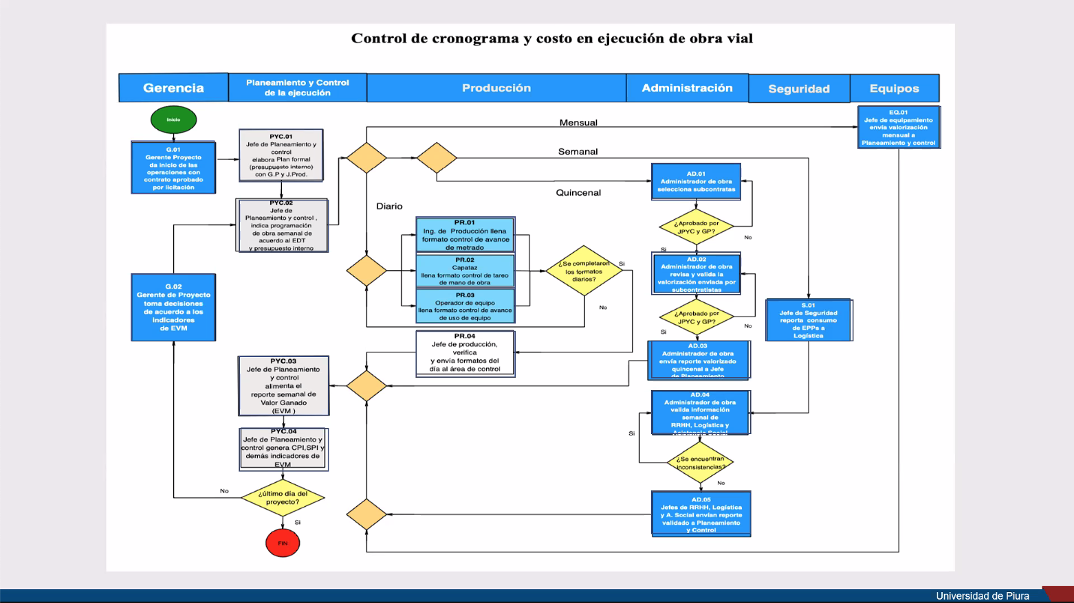 El objetivo principal de la investigación fue desarrollar una propuesta de mejora de los procesos de control e implementar un cronograma de los proyectos viales aplicando la metodología del valor ganado. Para ello, se diseñó un diagrama de flujo en donde se pueden exponer todos los procesos y el paso a paso de como la empresa a cargo del proyecto va trabajando, y cómo se originan los resultados del proceso. Los expositores implementaron también un organigrama que permite ver los niveles jerárquicos dentro de la organización y diferenciar a quien obedece cada jefe de área y cada gerente de proyecto.