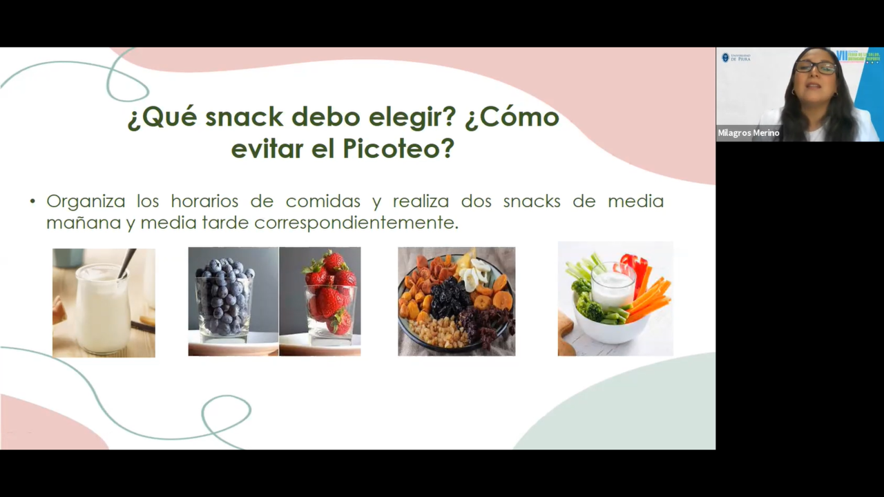 La última actividad estuvo a cargo de la licenciada Milagros Merino, quien desarrolló el tema Hábitos alimentarios de riesgo nutricional en universitarios. Durante su exposición, resaltó ciertas costumbres que en la selección, preparación y consumo de alimentos pueden ser inapropiadas y producir deficiencias nutricionales que conducirían a un menor rendimiento académico o afectaría el desarrollo de nuestras actividades.