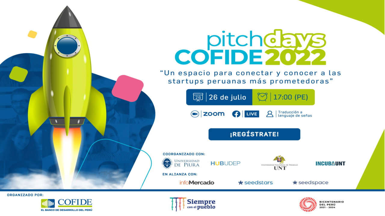 Por HUB UDEP. 20 julio, 2022.Este martes 26 de julio, a partir de las 5:00 p.m., se realizará el PitCh Days 2022, iniciativa virtual del Banco de Desarrollo del Perú (Cofide), en coordinación con la Universidad de Piura (UDEP) y la Universidad Nacional de Trujillo (UNT), que tiene como propósito mostrar el trabajo que vienen realizando los principales startups de Piura y La Libertad.