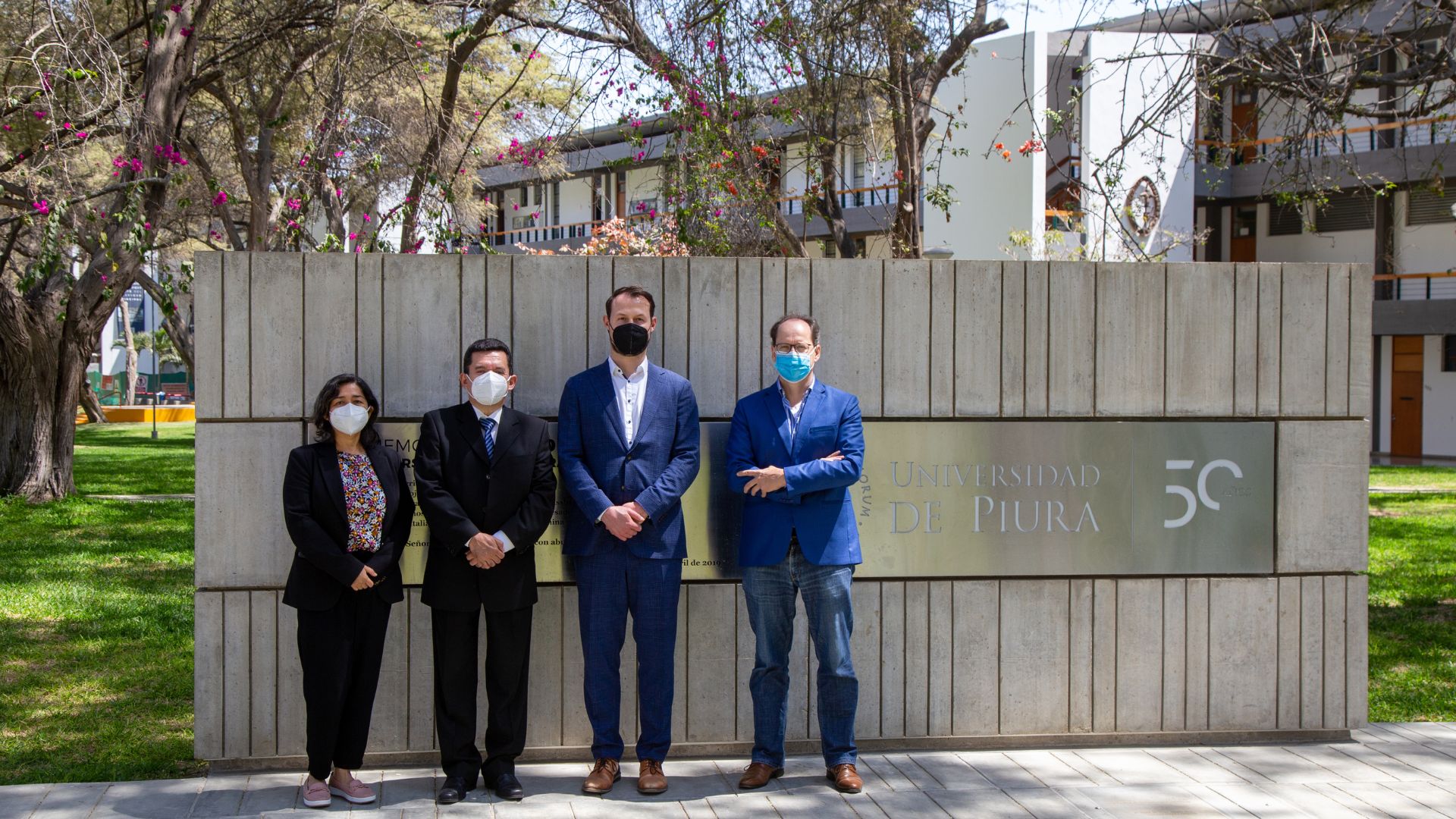Clements Hellemeier, consejero de Cultura y Prensa de la Embajada de Alemania y Rüdiger Punzet, director del Goethe-Institut Perú, visitaron la Universidad de Piura para coordinar, junto a Juan Carlos Arbulú, director del Centro de Idiomas de la UDEP, y a la directora académica de dicho centro, Diana Campos, detalles sobre un convenio que permita enseñar el idioma alemán en la universidad.