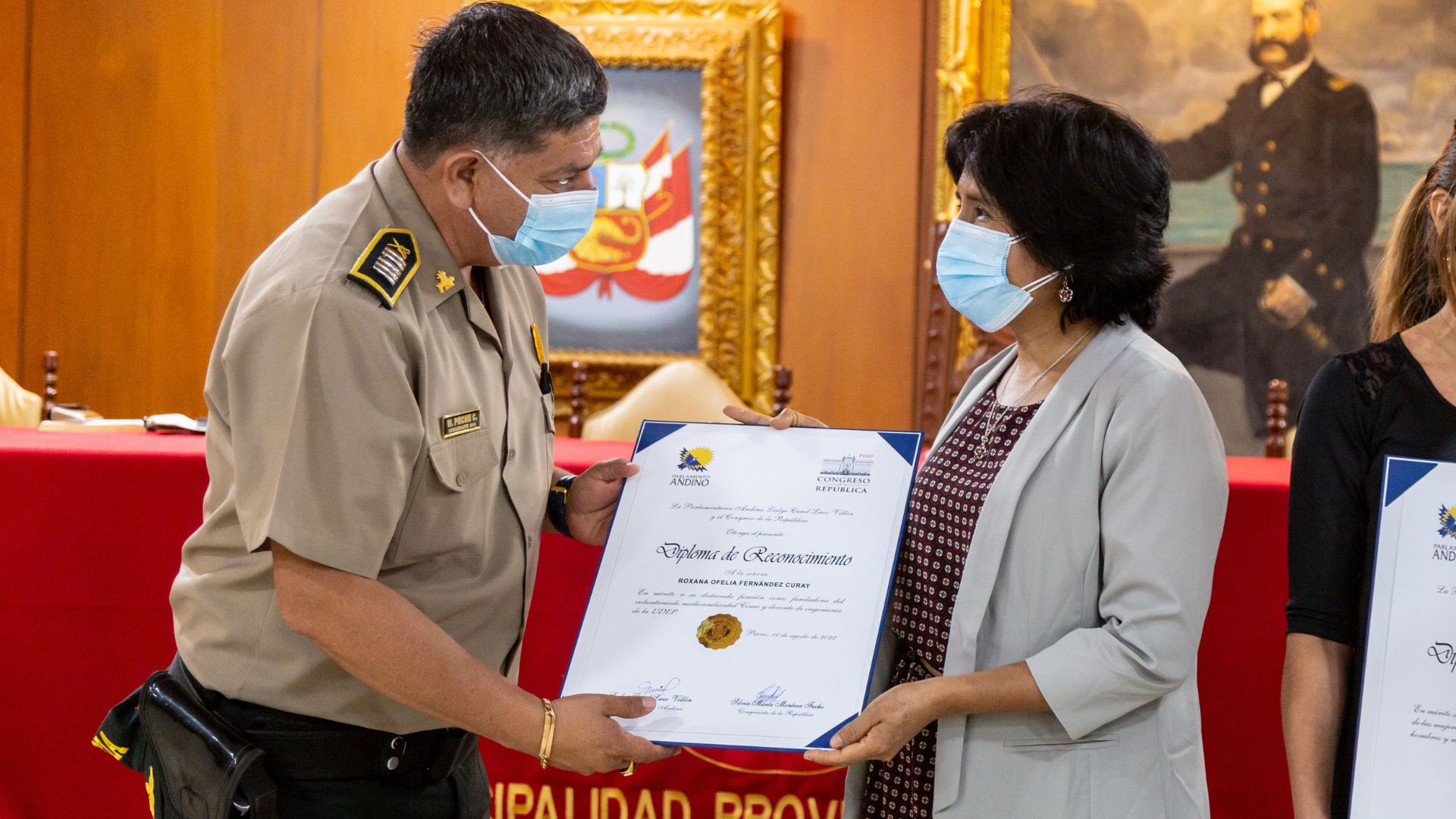 La ceremonia fue presidida por la parlamentaria andina, Leslie lazo; la congresista de la República, Silvia Monteza; el teniente alcalde, Pierre Gutierrez; y el comandante William Peche Cieza.