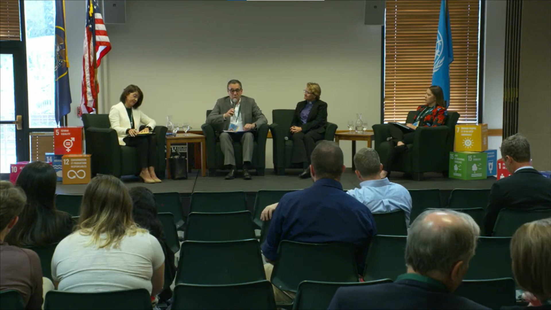En la Utah Valley University, la doctora Susana Mosquera moderó el panel de discusión sobre el ODS para reducir la desigualdad en los países; y María Fernanda Delfino, egresada de Comunicación, habló del “storytelling” corporativo.