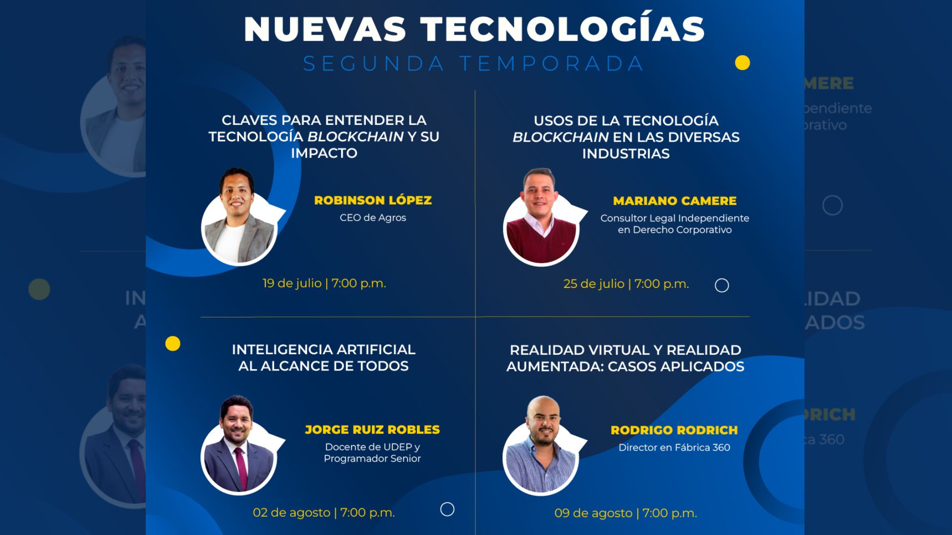 La Oficina de Graduados de la Universidad de Piura, Alumni, iniciará la segunda temporada de seminarios virtuales (webinars) denominado las “Nuevas tecnologías”, con la finalidad de brindar información a los egresados sobre las últimas tendencias y avances tecnológicos. Las charlas inician el 19 de julio; y serán dictadas en línea, a las 7 de la noche.