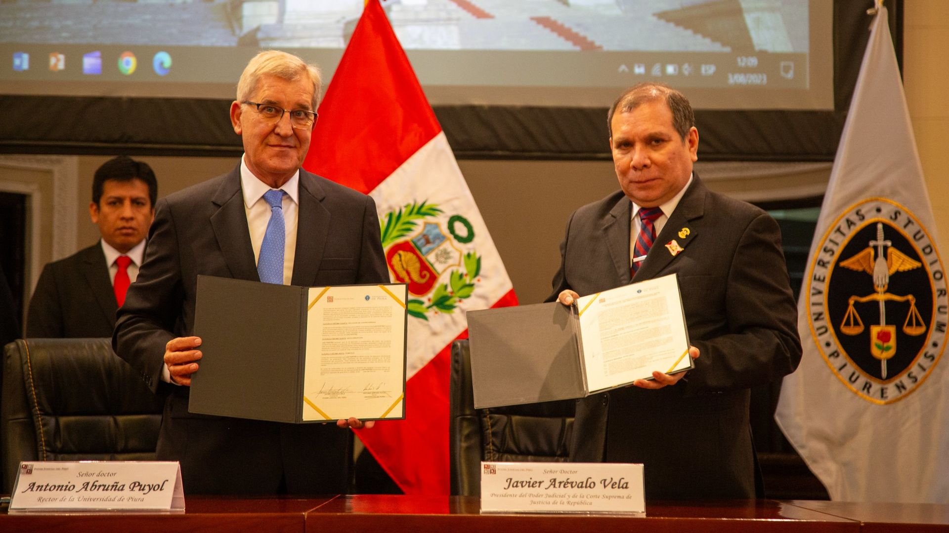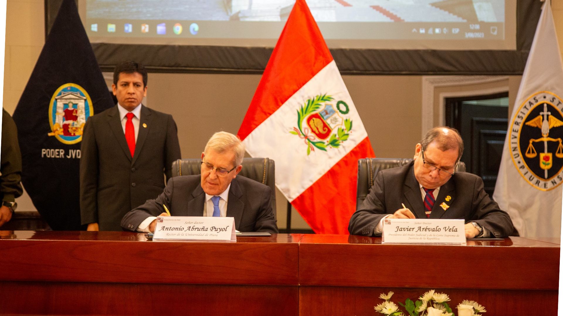 La firma del documento estuvo a cargo de los doctores Antonio Abruña, rector de la UDEP, y Javier Arévalo, presidente del Poder Judicial del Perú. Asistieron, también, magistrados en funciones, profesores de la Universidad de Piura y colaboradores de diferentes áreas del Poder Judicial.
