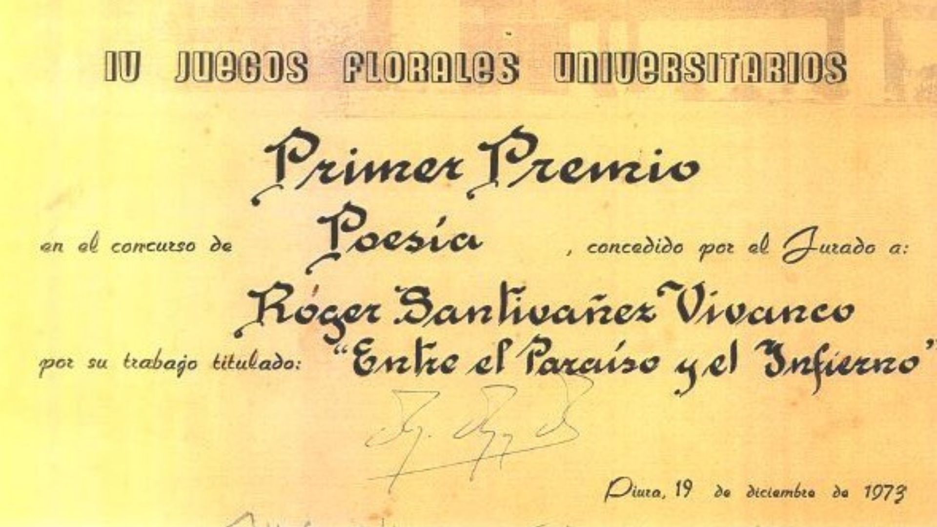 Por Dirección de Comunicación. 03 agosto, 2023.Con el seudónimo “El leñador”, Roger Santivañez presentó el poemario a la convocatoria realizada en 1973, por el entonces Programa Académico de Ciencias de la Información. El jurado integrado por profesores de la UDEP, artistas e intelectuales piuranos, declaró también ganadores a Javier Rey, por el poemario “Desde mi único país”; a María Gloria Puga, por “Un solo sonido” y a Gladys Vallebuona de Perea, por “Poemas de amor, tristeza y esperanza”, en el segundo, tercer y cuarto lugar, respectivamente.