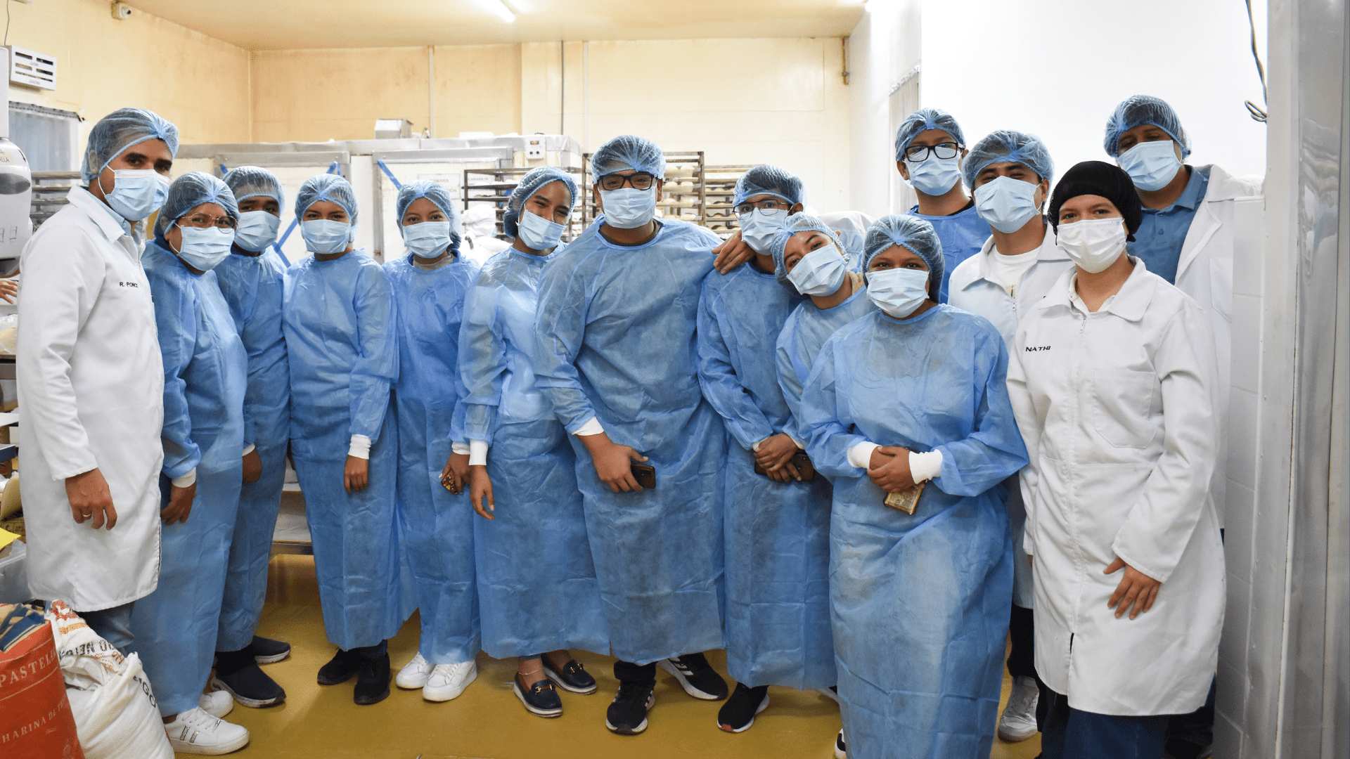 Durante la primera visita a la pastelería La Dominga, 14 estudiantes fueron guiados por Rodrigo Ponce, socio fundador, quien mostró el proceso de elaboración de los productos y compartió la historia, valores y filosofía de la empresa.