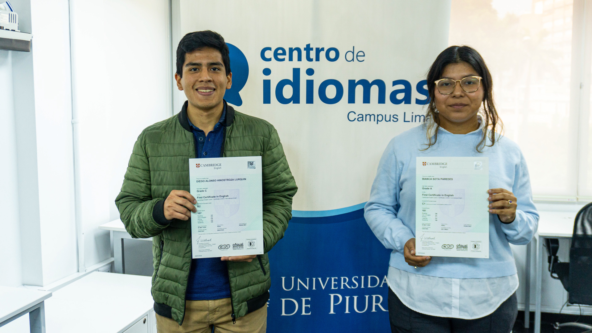 Diego Hinostroza y Bianca Sota, alumnos del programa académico de Administración de Empresas, obtuvieron la certificación Cambridge al rendir los exámenes en la nueva modalidad Digital, disponible en el Centro de Idiomas de Campus Lima.