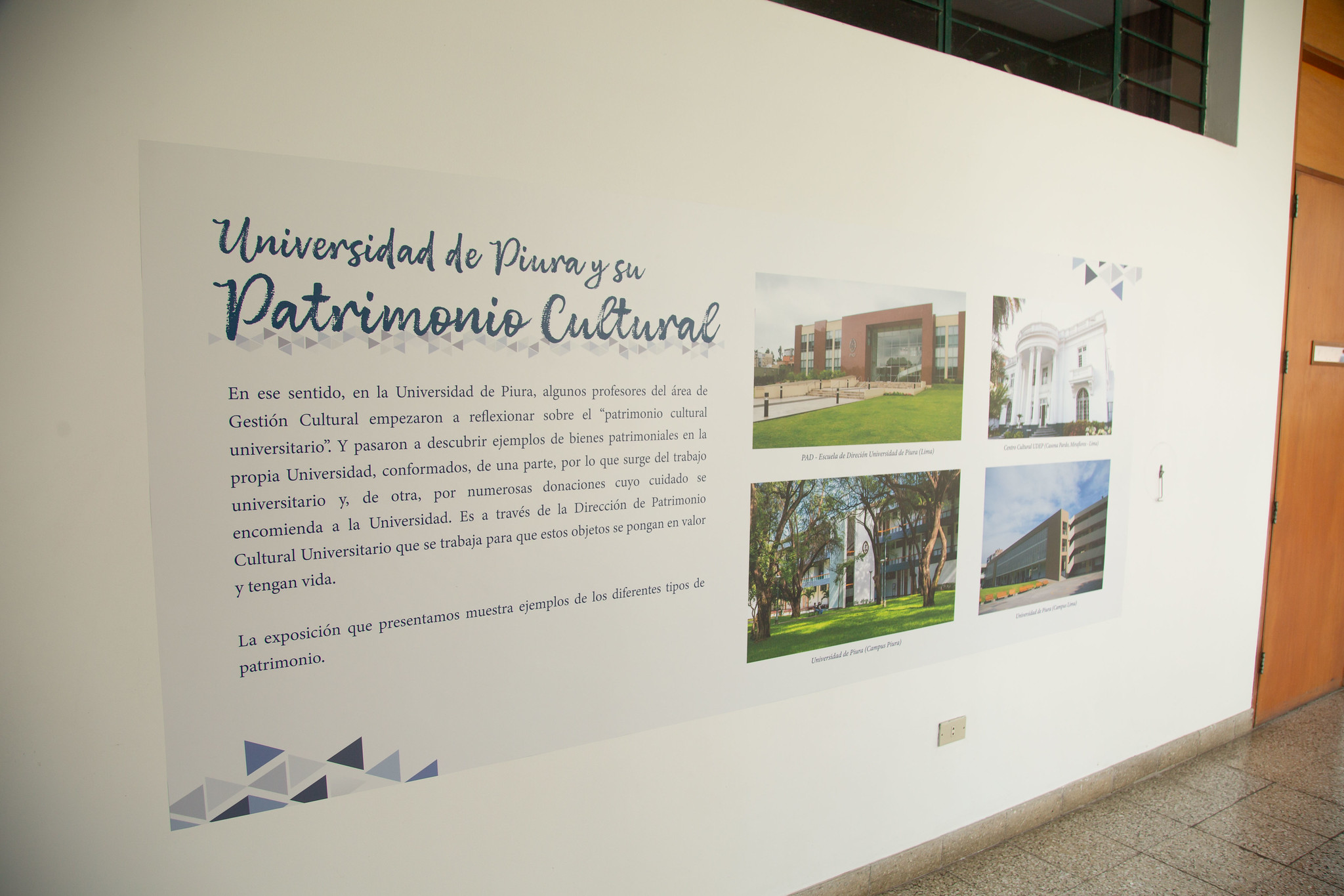 En la exposición se puede encontrar información sobre el patrimonio material (arqueológico, bibliográfico, arquitectónico, pictórico, documental, artesanal, fotográfico) e inmaterial (recuerdo y memoria, poemas a la universidad, etc.). Esta muestra ofrece una visión integral del vasto y diverso patrimonio que la Universidad de Piura se compromete a preservar y poner en valor.