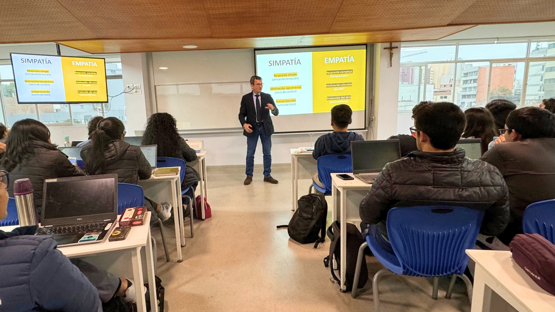 Uno de los momentos más destacados fue su participación en el seminario de Bioética II con los alumnos de sexto año de la Escuela Profesional de Medicina Humana. Durante esta actividad, el especialista en bioética y educación médica, escuchó las presentaciones de los estudiantes, ofreciendo comentarios valiosos basados en su amplia experiencia. Además, participó en un conversatorio con los alumnos, donde se abordaron temas como la empatía clínica y la ética, fomentando un espacio de reflexión y aprendizaje mutuo.