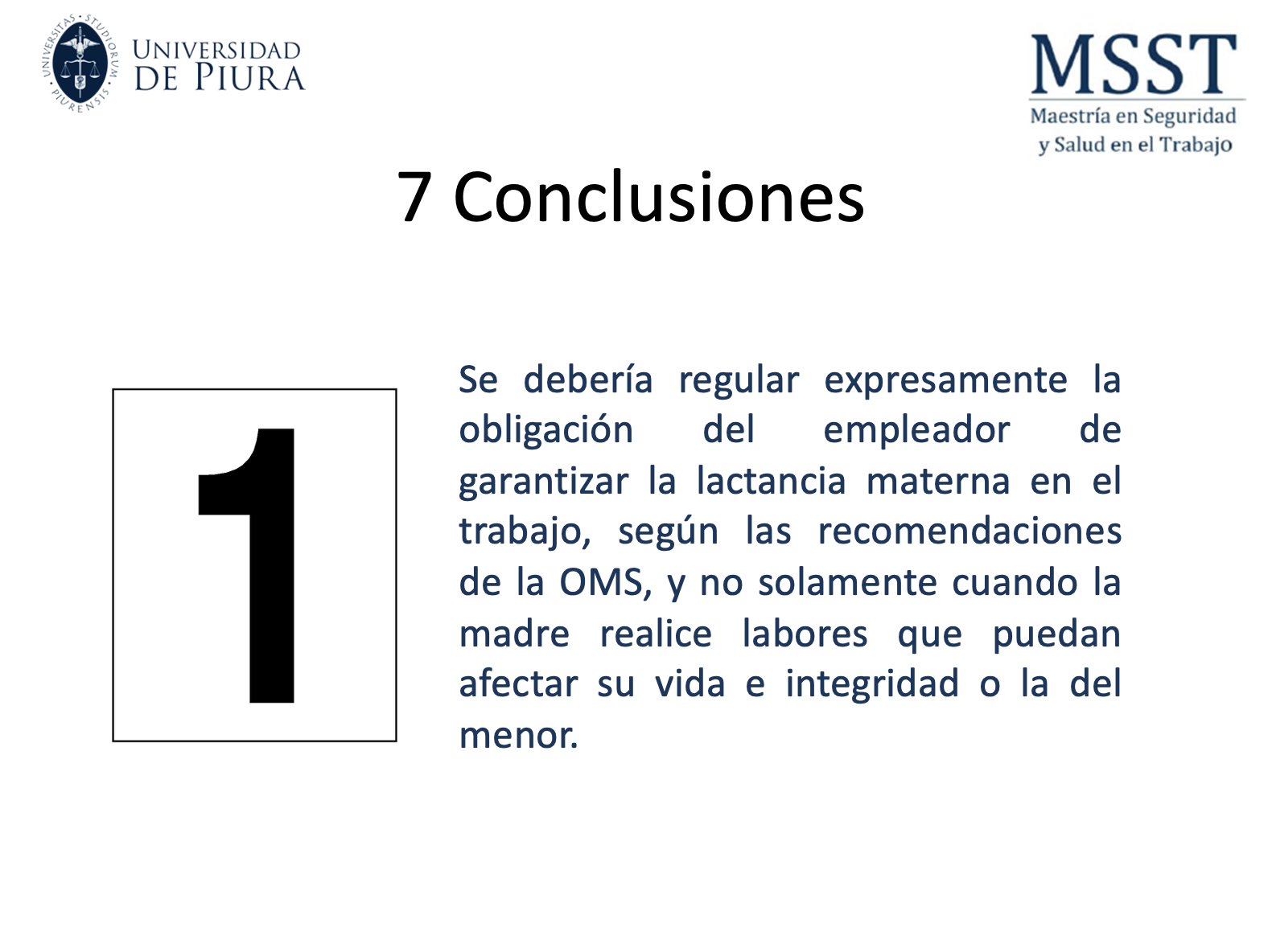 En las conclusiones del estudio, Seminario señala que se debería regular expresamente la obligación del empleador de garantizar la lactancia materna en el trabajo, según las recomendaciones de la OMS, y no solamente cuando la madre realice labores que puedan afectar su vida e integridad o la del menor.
