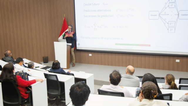 En el acto de reconocimiento, el profesor Sánchez expuso la clase magistral “Modelos estadísticos para la predicción de caudales: Desarrollo de una herramienta de predicción operativa para las cuencas de los ríos Chira y Piura”. Explicó el desarrollo de una herramienta operativa, plasmada en un software, en el marco de su proyecto de investigación sobre los caudales de los ríos mencionados. El trabajo busca que se tome conciencia de la importancia de monitorear para hacer predicciones; que se conozca la gestión del agua para tomar decisiones y que se realice el seguimiento necesario.