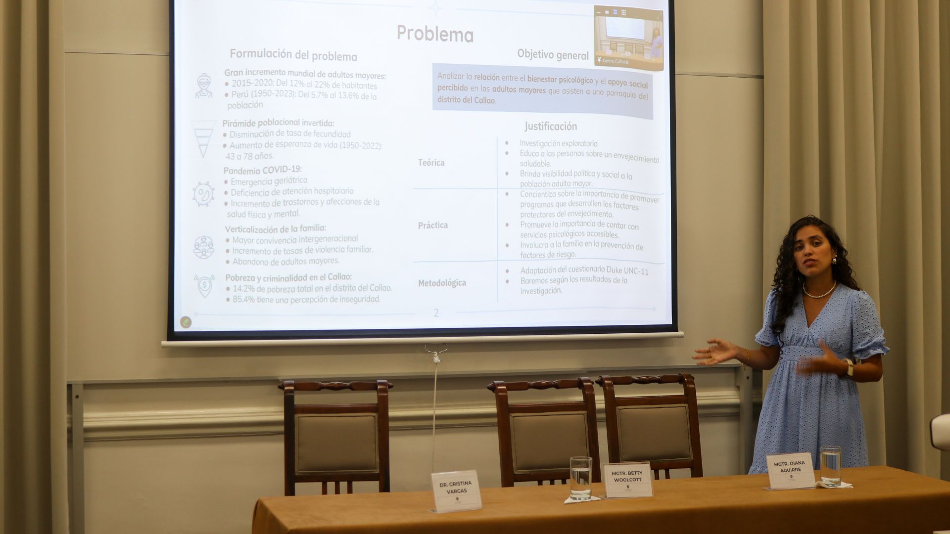 La psicóloga Betty Woolcott presentó la investigación “Bienestar psicológico y apoyo social percibido en adultos mayores que asisten a una parroquia del distrito del Callao, Perú”. En su presentación subrayó que existe una relación entre el bienestar psicológico y el apoyo social que perciben los adultos mayores.