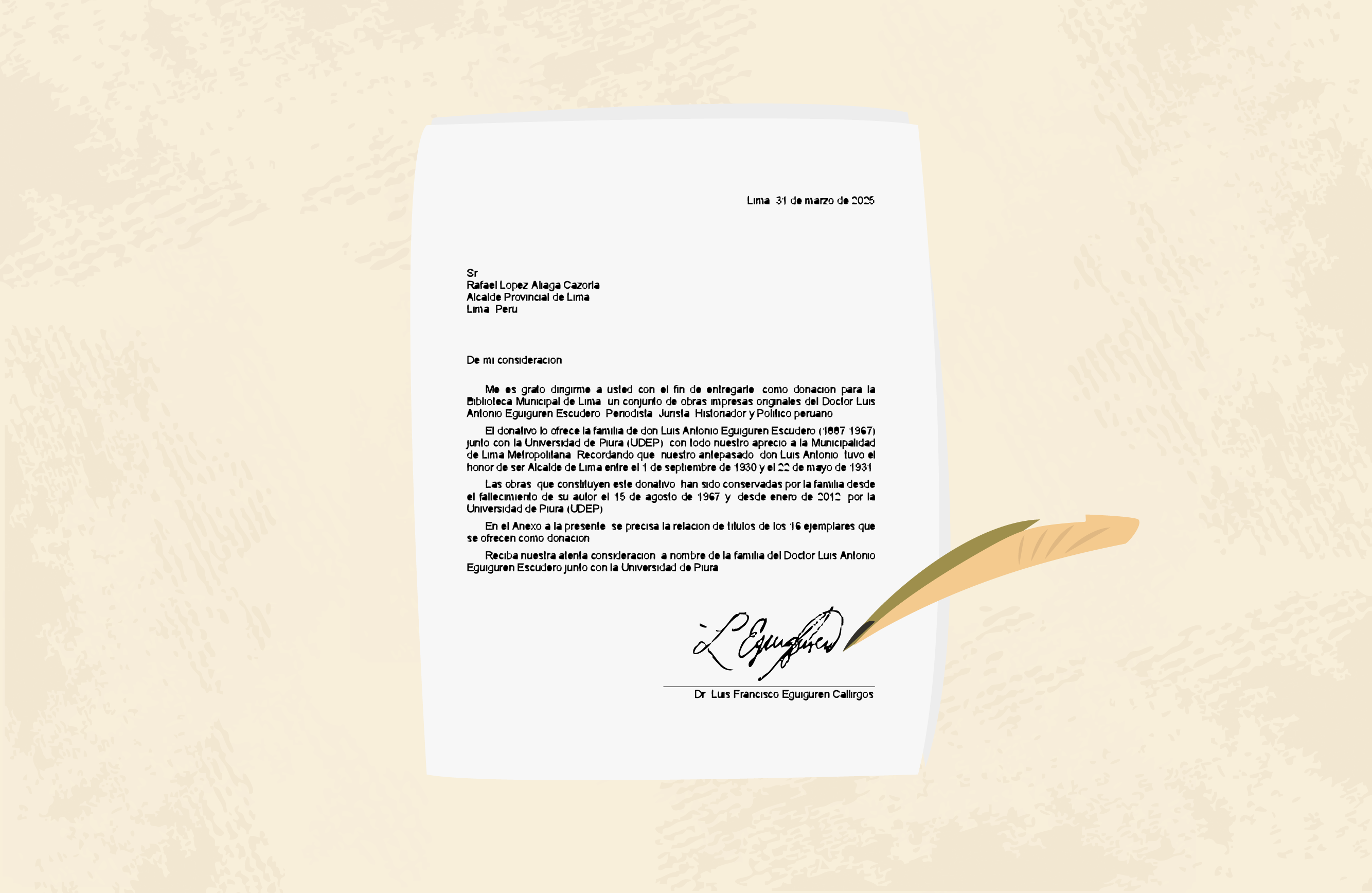 En una misiva dirigida al alcalde de Lima, Rafael López Aliaga, Eguiguren Callirgos destaca que la donación se realiza en conjunto con la Universidad de Piura, la cual, desde el 2012, ha colaborado en la conservación de estos documentos históricos.