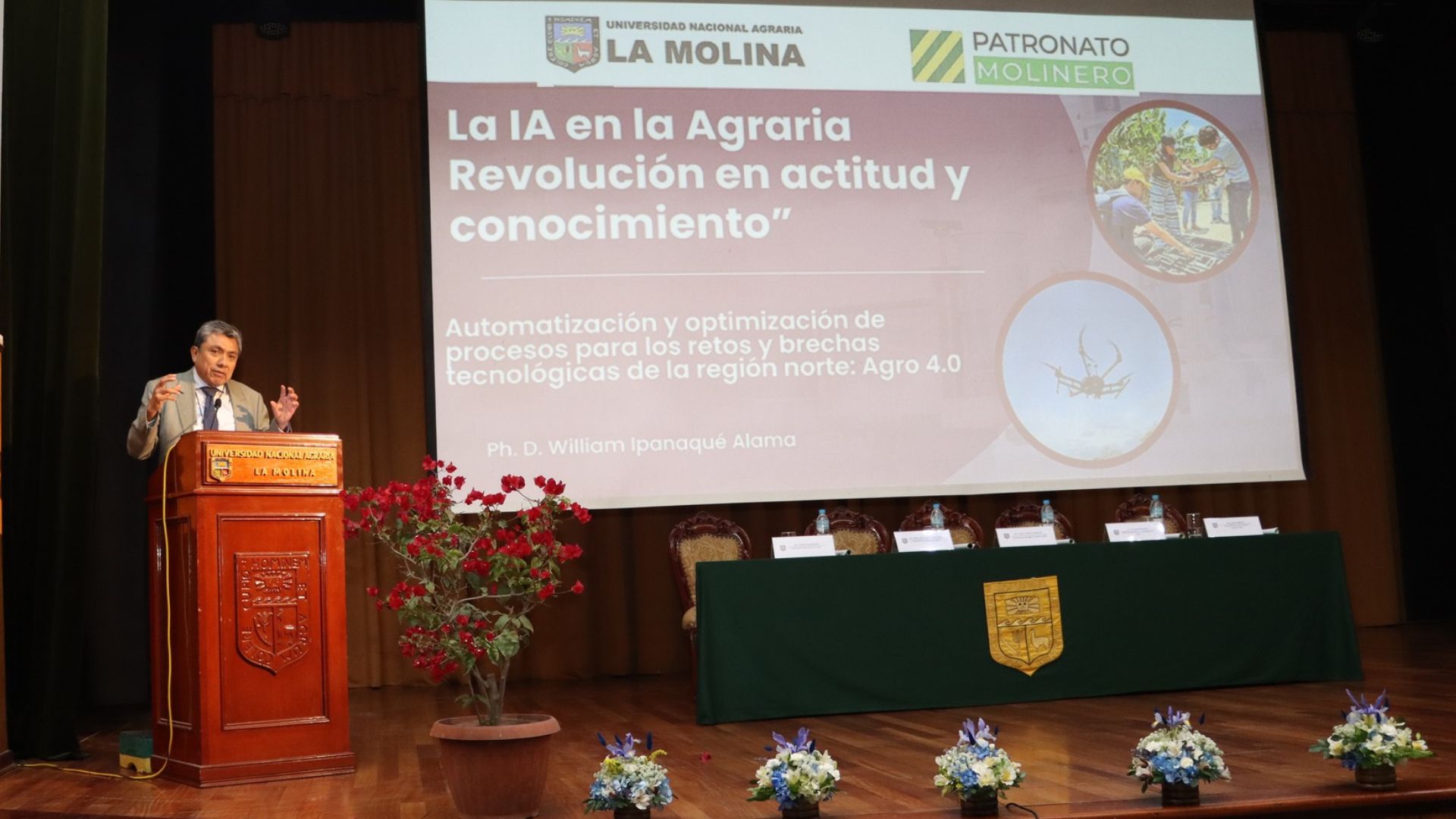 En su conferencia, dictada en la Universidad Nacional Agraria La Molina, el profesor Ipanaqué destacó proyectos con inteligencia artificial que mejoran la productividad agrícola, la gestión hídrica y el control de plagas en cultivos.