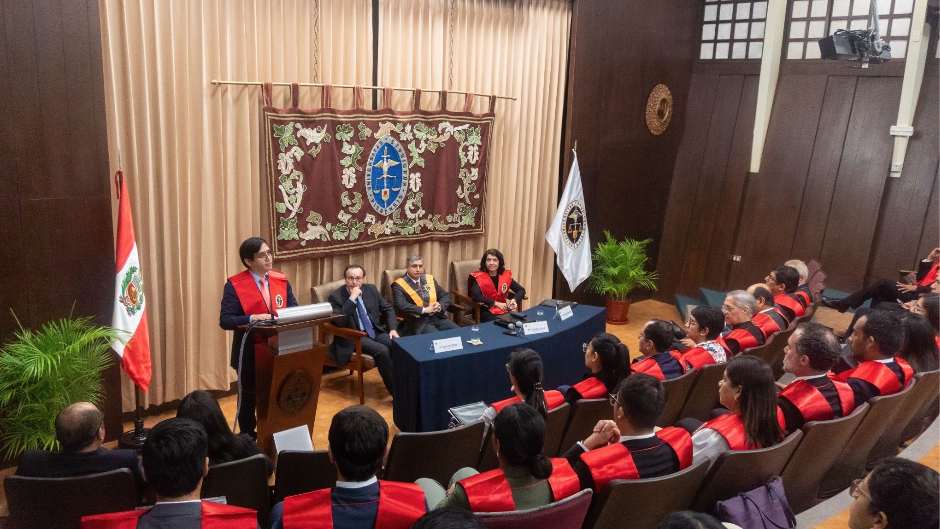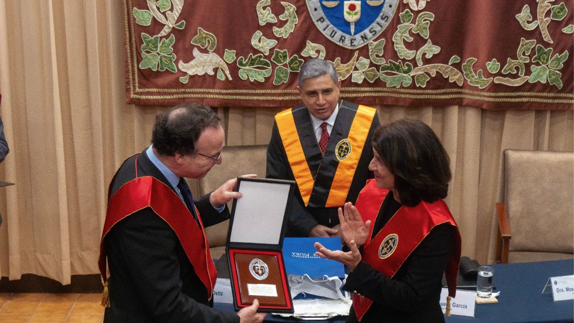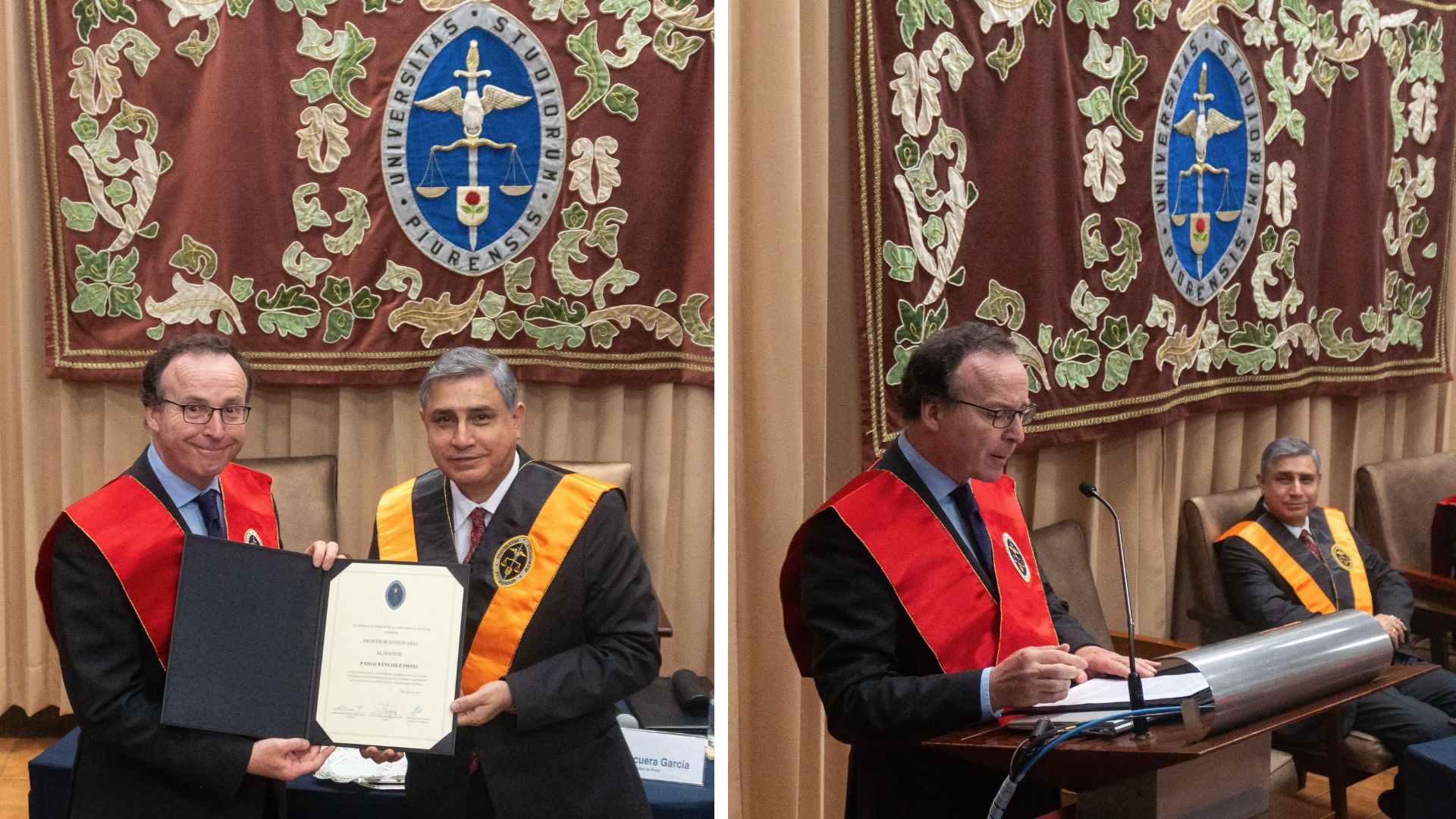 Posteriormente, la decana, doctora Susana Mosquera, leyó el Acuerdo del Consejo Superior que oficializa la incorporación del profesor honorario. Asimismo, le entregó una placa conmemorativa. Luego, el rector, doctor Paul Corcuera, le impuso la insignia de la UDEP y subrayó: “La distinción que hoy le otorga nuestra universidad quiere ser una invitación a seguir construyendo juntos. Valoramos no solo lo que ha hecho, sino lo que su presencia futura puede aportar a la vida académica de nuestra casa de estudios”.