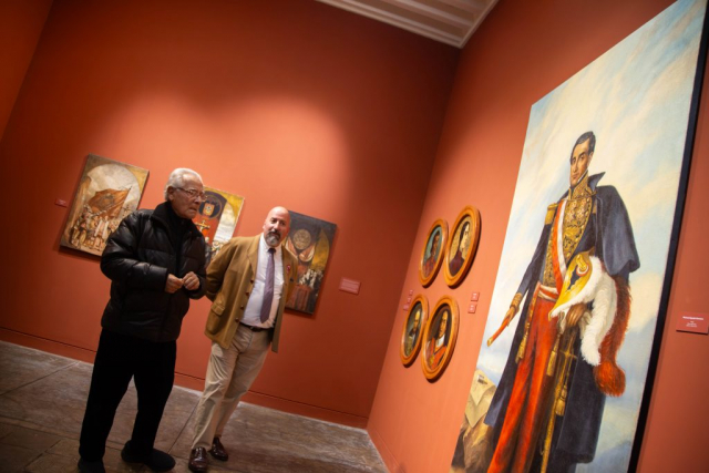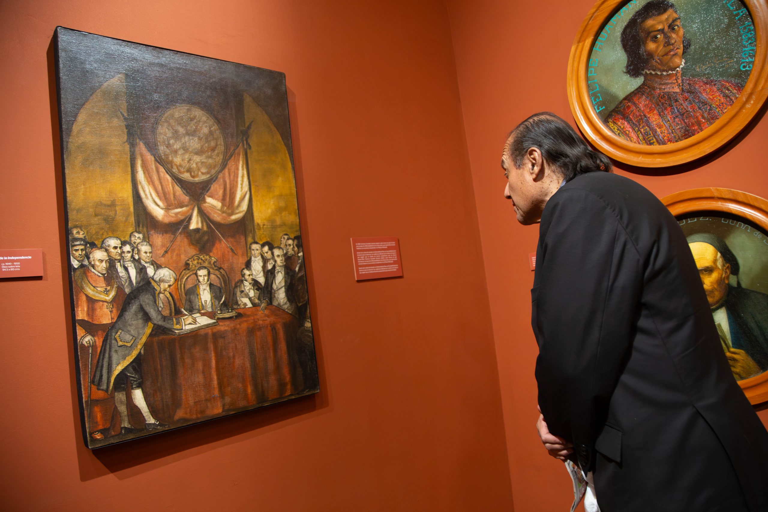 En la explicación de su obra, el cusqueño afirma: “No soy de los que cree que una pintura debe ser mural para ser grande. Pienso que los acontecimientos trascendentales y las acciones heroicas de la figura de hombre que simboliza el momento culminante del desarrollo en nuestro país debe ser expresado en dimensiones equivalentes”, lee el doctor Sebastián.
