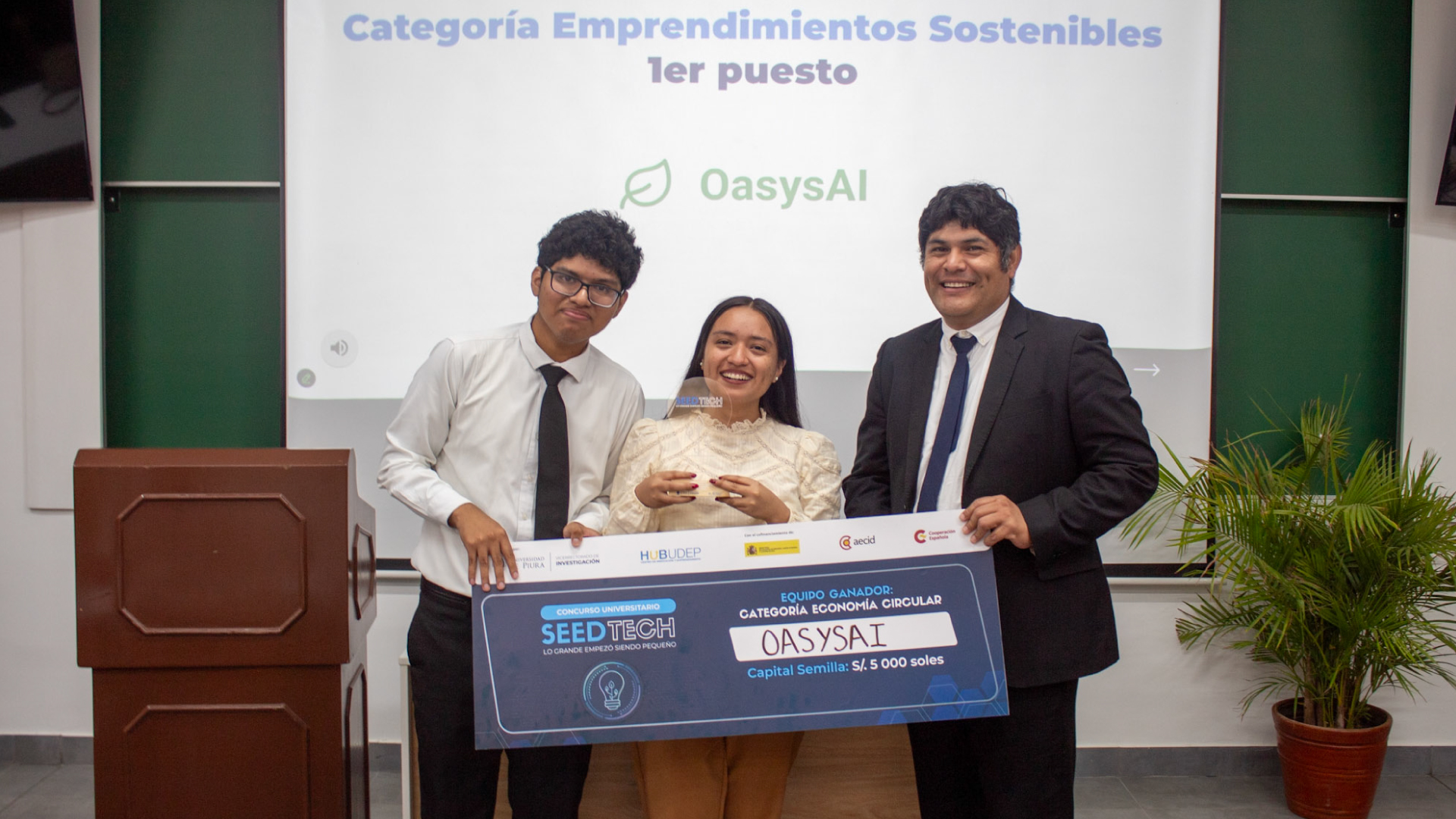 En la categoría de Economía Circular, el primer puesto fue para los creadores de OasysAI. Propone un sistema de humedal artificial inteligente diseñado para el tratamiento de aguas residuales y su posterior reutilización en el riego de áreas verdes. Además, integra inteligencia artificial para optimizar la eficiencia del sistema y logra un equilibrio entre tecnología, sostenibilidad ambiental, viabilidad económica e integración paisajística.