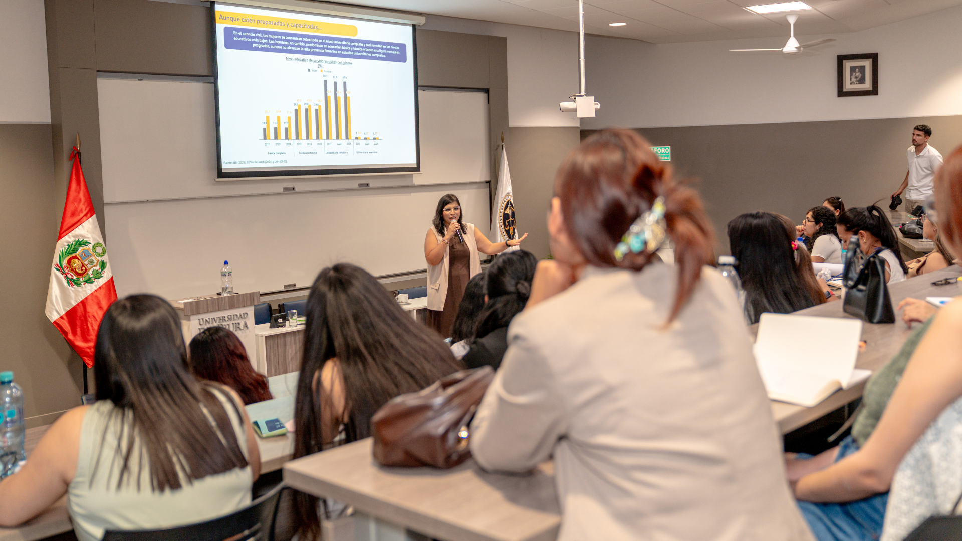 Durante su exposición, Muñoz presentó un análisis actualizado sobre la situación laboral de las mujeres en el Perú. Señaló que la brecha persiste: por cada sol que recibe un hombre, una mujer obtiene solo 76 céntimos. Indicó también que la participación femenina en el sector público aumentó en los últimos años gracias a la meritocracia y al mayor número de profesionales calificadas, lo que elevó su presencia de 42% a casi la mitad de los servidores estatales.