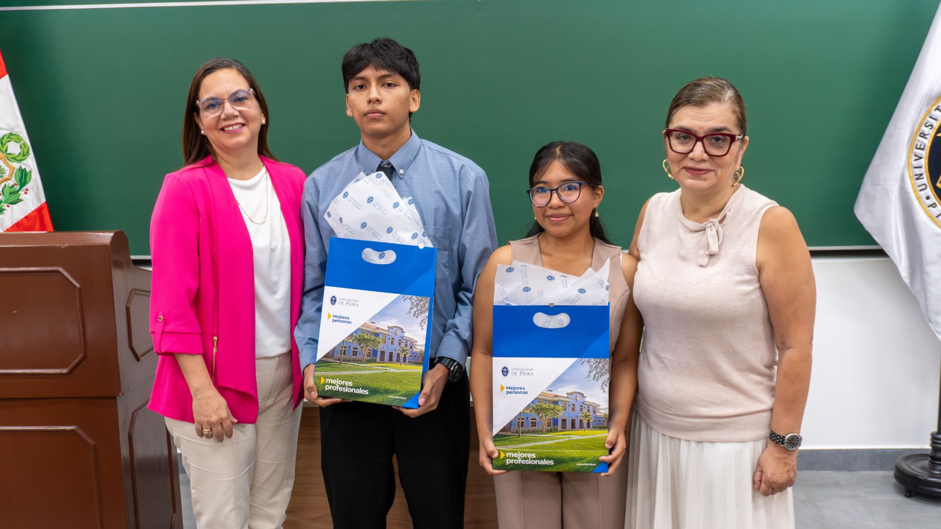 La entrega de la beca se realizó el 27 de febrero y contó con la presencia de Milena Lema, vicedecana de la Facultad de Ciencias de la Educación; Mara Seminario, presidenta de Piura en Acción; los becados y sus familias.
