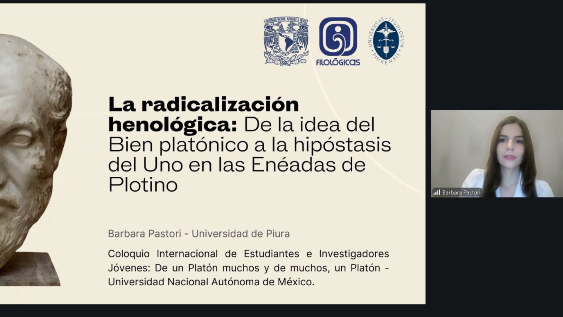 Bárbara Pastori participó, de modo virtual, en el coloquio organizado por la Universidad Nacional Autónoma de México (UNAM). Expuso sobre la relación entre la filosofía de Platón y el pensamiento neoplatónico de Plotino.