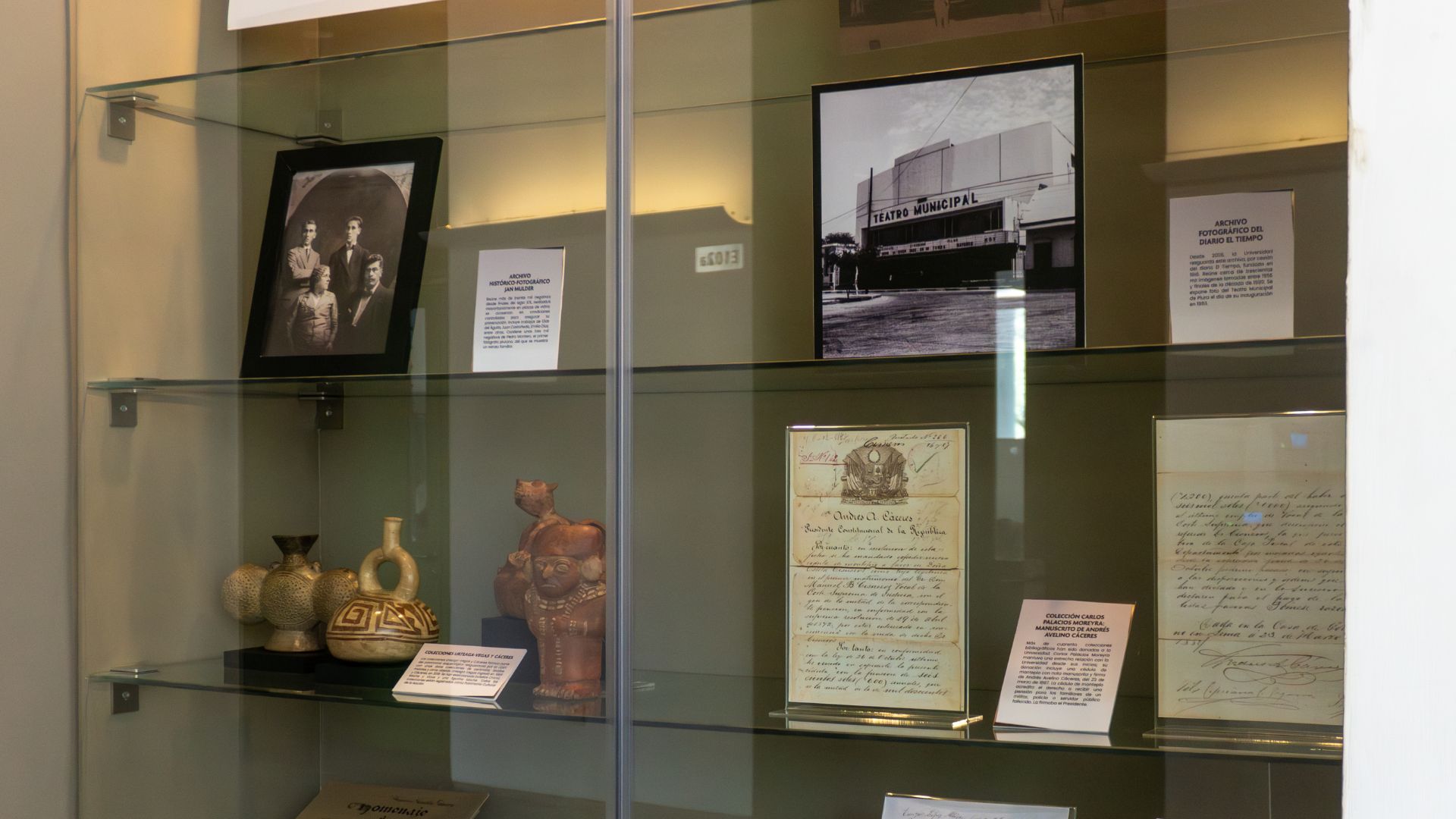 En la segunda vitrina, se exponen colecciones y objetos donados a la universidad, como las colecciones arqueológicas entregadas por Eduardo Cáceres Chocano y por la familia Urteaga-Vegas; los planos del reconocido arquitecto Enrique Seoane, fotografías del diario local El Tiempo, la máquina de escribir de Federico Kauffmann Doig, así como un manuscrito de Andrés Avelino Cáceres.