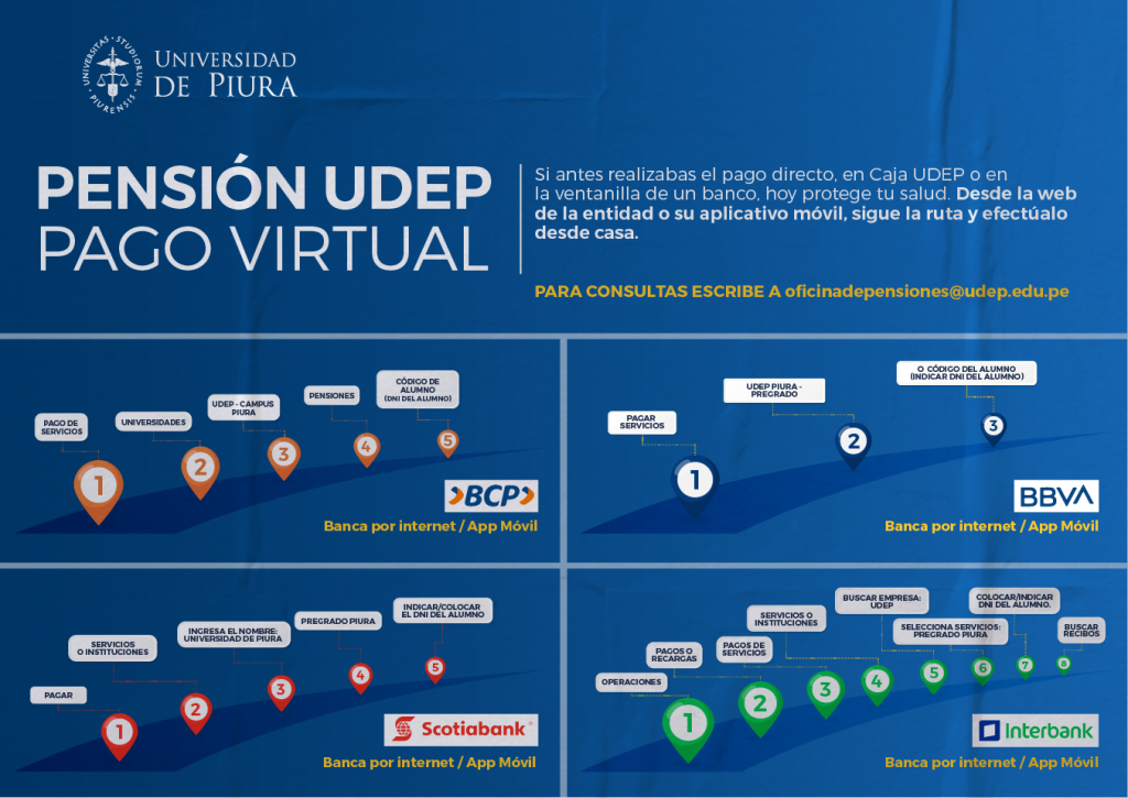 Está habilitado el pago a través de los aplicativos o páginas web de las siguientes entidades bancarias: BCP, BBVA, Interbank, Scotiabank. Al seguir el proceso que se indica a continuación, se cargará de manera automática la información correspondiente a la pensión del alumno.