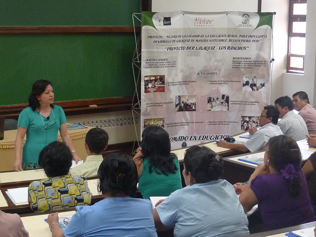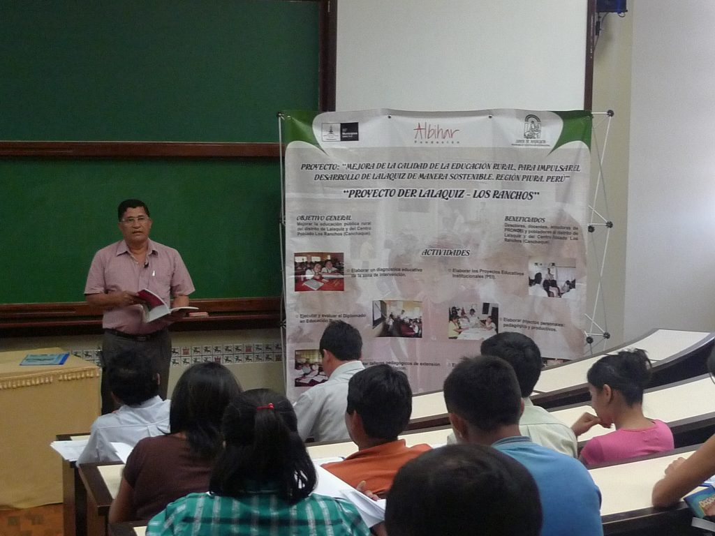 Proyecto: “Mejora de la calidad de la educación rural, para impulsar el desarrollo de Lalaquiz de manera sostenible. Región Piura. Perú” Objetivo Con el fin de mejorar la educación pública rural del distrito de Lalaquiz y el centro poblado Los Ranchos el presente Proyecto se propuso atender las necesidades educativas básicas de los docentes, teniendo como objetivos: Beneficiarios Docentes del distrito de Lalaquiz y de centro poblado Los Ranchos (Distrito de Canchaque), provincia de Huancabamba, departamento de Piura. Convocatoria Entidad solicitante Socio Local Ubicación Duración