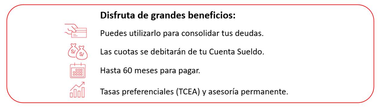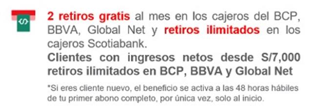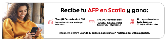 BENEFICIOS DE CUENTA SUELDO: Beneficios se activan para clientes que reciban el abono de su sueldo en su Cuenta Sueldo de Scotiabank de forma mensual, luego de 48 horas de haber recibido el abono de planilla. (1) Retiro en cajeros de otros Bancos: válido hasta el 31/12/24. Hasta 2 retiros gratis al mes a nivel nacional para ser utilizados en los cajeros de BCP, BBVA Perú y GlobalNet. A partir del quinto (5to) retiro en el mes se cobrará la comisión de S/ 20. Clientes dependientes: el beneficio se activará a las 48 horas del primer abono de planillas y se mantendrá mientras se reciban dichos abonos de manera mensual en la Cuenta Sueldo. Clientes independientes: el beneficio se activará a las 48 horas de haber recibido abono(s) por un importe mayor o igual a S/ 1,000 y se mantendrá mientras se reciban dichos abonos por ese monto de manera mensual en la Cuenta Sueldo. (2) Transferencias interbancarias: no se cobra comisión a las transferencias interbancarias realizadas desde la Cuenta Sueldo, siempre y cuando se realicen a través del app o web de Scotia a la misma plaza. (3) Adelanto de Sueldo: Aplica para clientes bajo campaña aprobada, hasta el 40% del sueldo (máximo S/ 10,000). Crédito a una sola cuota y comisión por concepto de Descuento Automático por Adelanto de Sueldo (4.5%, mínimo 16 soles), serán descontadas en el siguiente abono de planilla. (4) Mejores condiciones financieras: Aplican condiciones y/o restricciones de acuerdo a cada producto. TREA preferencial para cuenta CT, si cliente tiene Cuenta Sueldo activa y con fondeo mensual. Préstamos sujetos a evaluación crediticia y sustento de ingresos. (5) Quiero+: Para conocer más sobre las condiciones y las promociones y descuentos vigentes de Quiero+, consultar en www.scotiabank.com.pe/Personas/tarjetas/quiero o descargar el App Quiero+ disponible en App Store y Google Play. (6) Scotiapuntos: Para conocer más sobre las condiciones de los Scotia Puntos, consultar en https://www.scotiabank.com.pe/Personas/scotia-club/scotia-club/scotia-puntos. (7) Descuento del mes: Para más información sobre las condiciones de la promoción, revisar en el app Quiero+ o en www.scotiabank.com.pe/Personas/tarjetas/quiero. Para mayor información sobre beneficios de Cuenta Sueldo, ingresar a https://www.scotiabank.com.pe/Personas/Ahorros/Cuentas-Bancarias/cuenta-sueldo. Depósitos cubiertos por el Fondo de Seguro de Depósitos hasta por S/ 121,910 para el periodo Junio – Agosto 2022, el monto puede variar trimestralmente. Más información en fsd.org.pe. ITF 0.005%. Para más información sobre tasas, comisiones, gastos, y demás condiciones, consulte el tarifario en la red de agencias Scotiabank o en www.scotiabank.com.pe. Toda referencia a SCOTIA o Scotiabank se refiere a Scotiabank Perú S.A.A. ®Marca registrada de The Bank of Nova Scotia. |