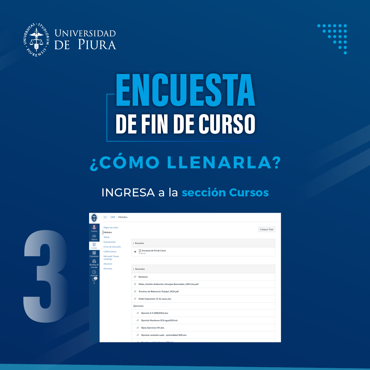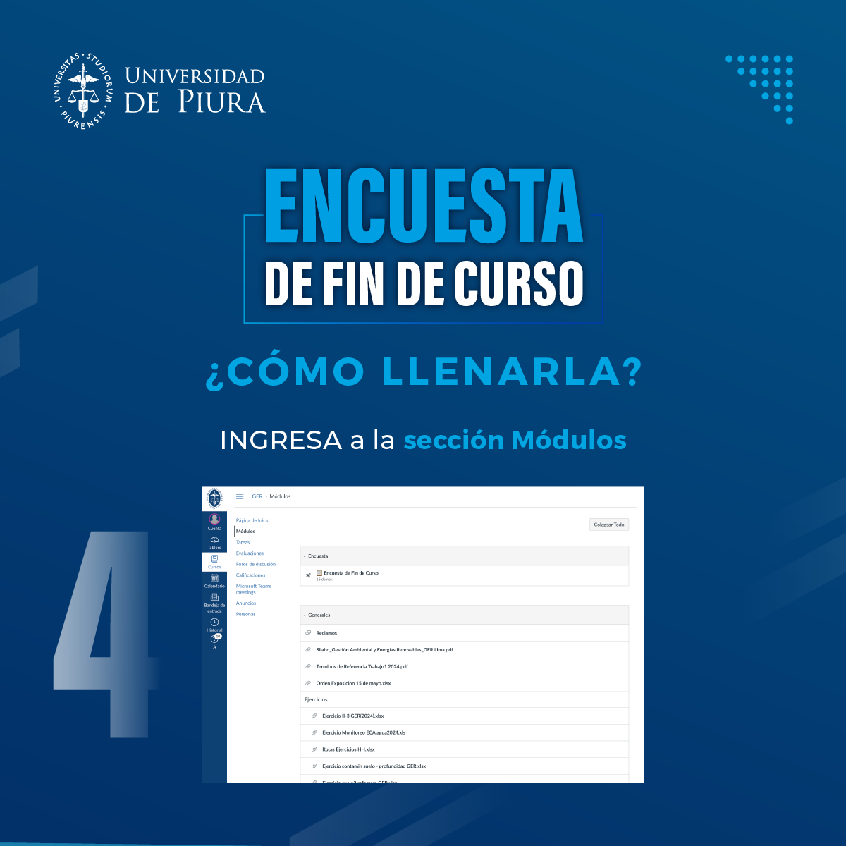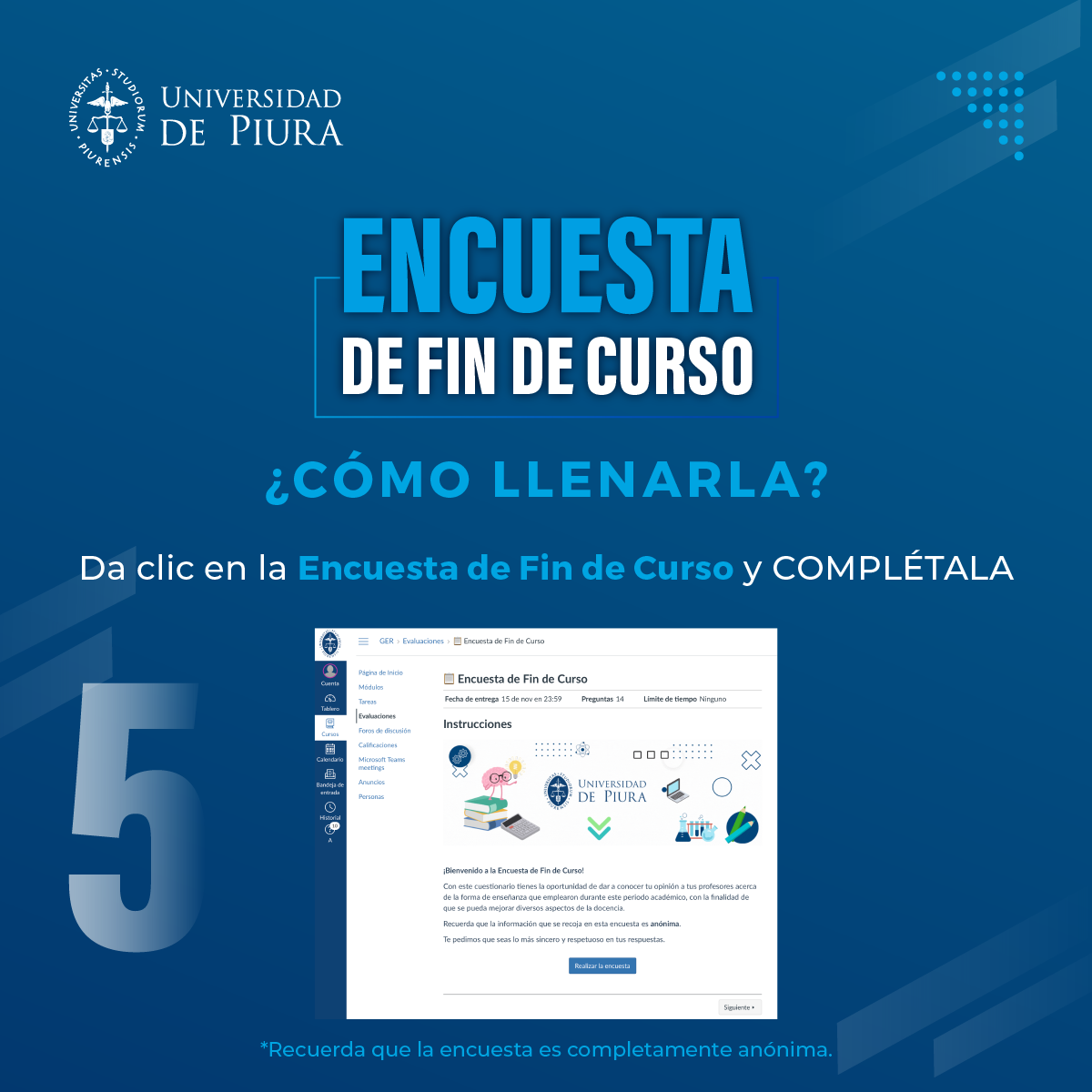 Tu opinión nos ayuda a mejorar. Por ello, queremos invitarte a participar en la Encuesta de Fin de Curso, que se aplicará hasta el 15 de junio. Esta encuesta nos permitirá conocer tu opinión sobre la labor que han desempeñado tus profesores en este periodo académico en cada uno de los cursos desarrollados, el diseño de las asignaturas y el acondicionamiento de las aulas.